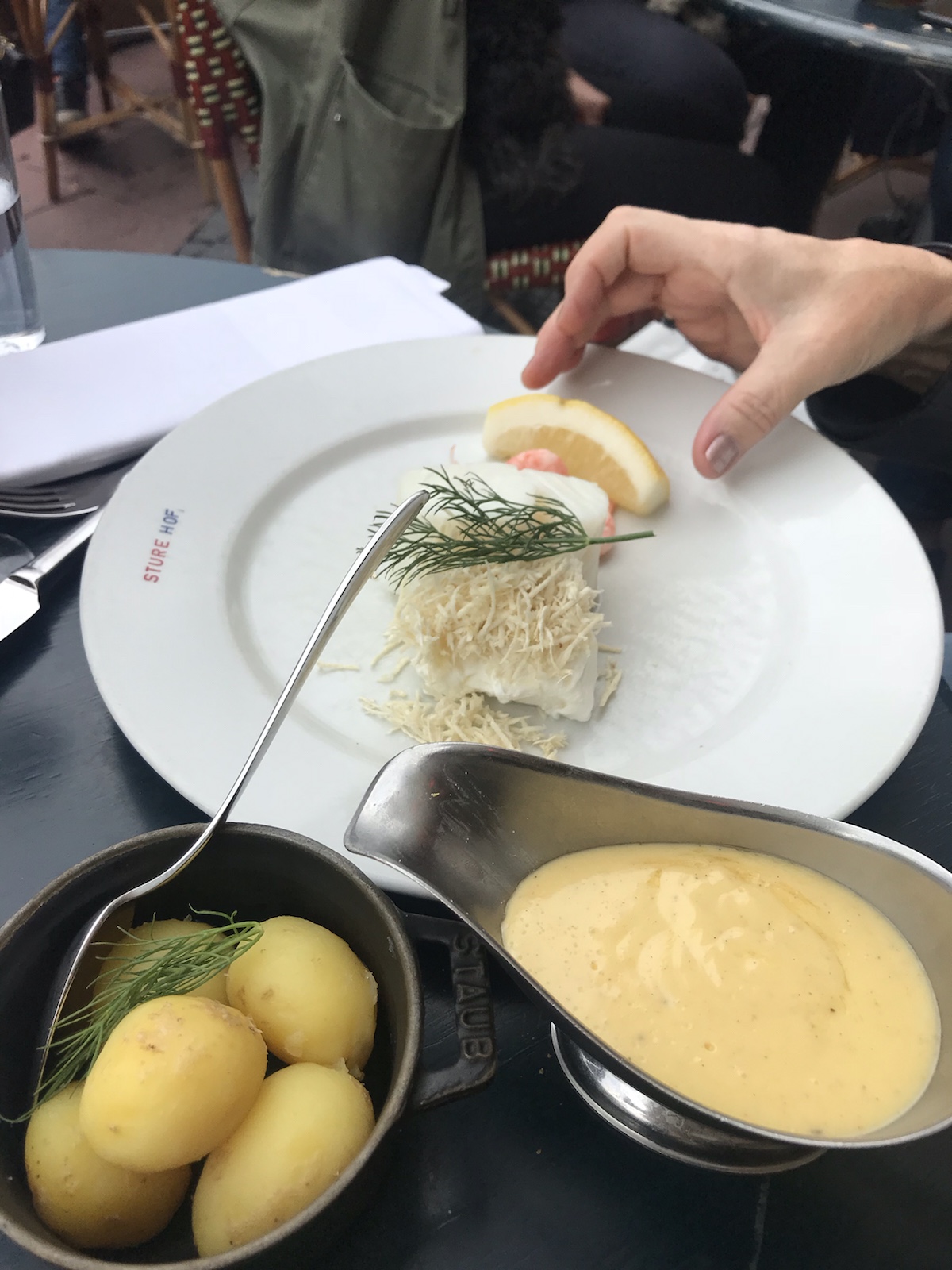 Firade lilla mammas födelsedag med lunch på Sturehof i lördags. Vädret var ju faktiskt helt ok och vi kunde till och med sitta ute. Vi valde fisk båda två och maten var förstås supergod, Men, och nu måste jag gnälla lite, min tallrik hade nog stått en bra stund innan de la på den friterade fisken och serverade för både moset och såsen var ljummet. Såsen hade också fått ”skinn”. Jag har högre förväntningar på Sturehof så detta är egentligen inte okej. Men samtidigt vill man inte gnälla sönder en mysig och trevlig lunchstund så jag valde att tugga i mig och se glad ut, det var ju ändå gott. Sen strosade vi lite runt på stan och gled slutligen in på Eataly där vi avslutade kvällen med en focaccia och en aperol. Väl hemma kollade vi på A star is born. Har inte velat se den tidigare för jag visste att den var sorglig. Men nu kände jag mig redo och den var förstås precis lika bra som alla hade sagt. / Maria <3