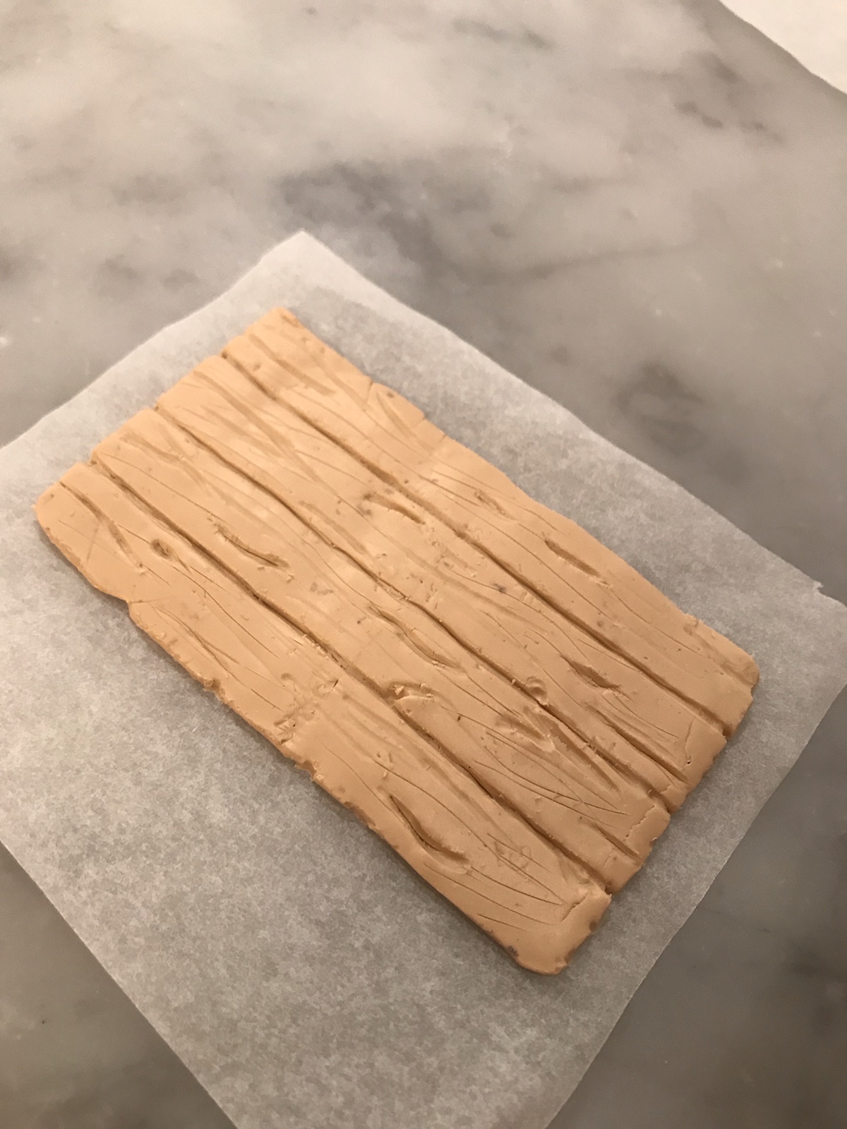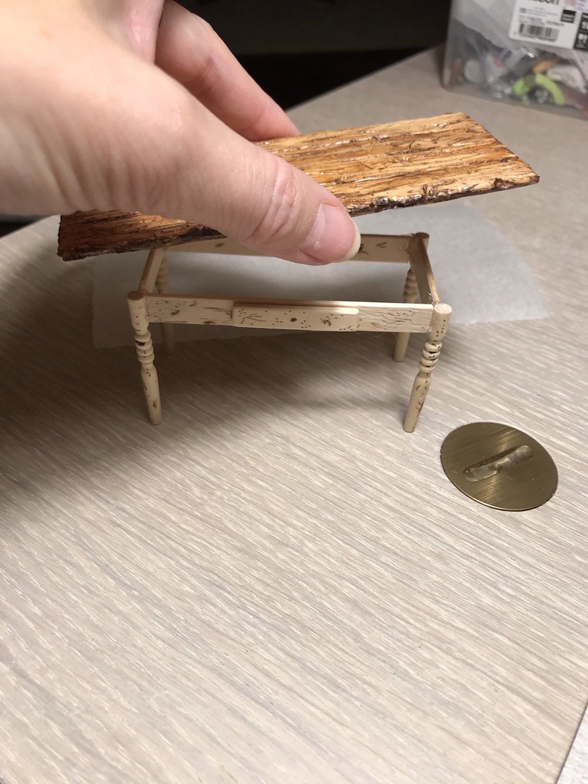 Hej, pyssel-produktionen är i full gång och frågar ni mina nära och kära så tror jag att de tycker att jag är smått besatt. Och det kanske stämmer, för när idéerna och lusten flödar är det svårt att låta bli. Bordet på bilden började med att jag gjorde ett par bordsskivor i Fimo-lera. Jag målade dem efter härdning med soft pastel i olika bruna nyanser för att förstärka det gamla och slitna utseendet och lackade sedan för att skydda färgen.