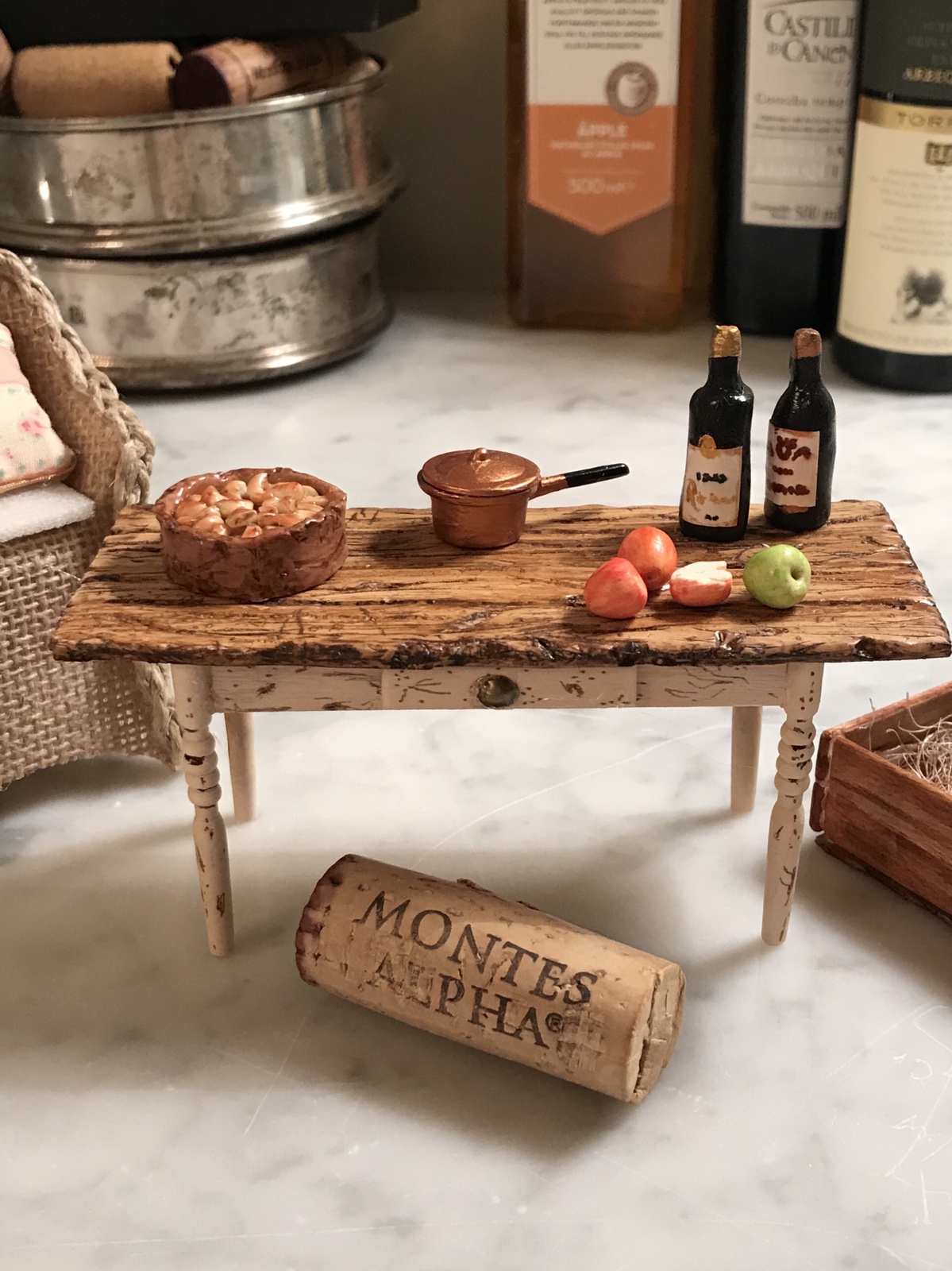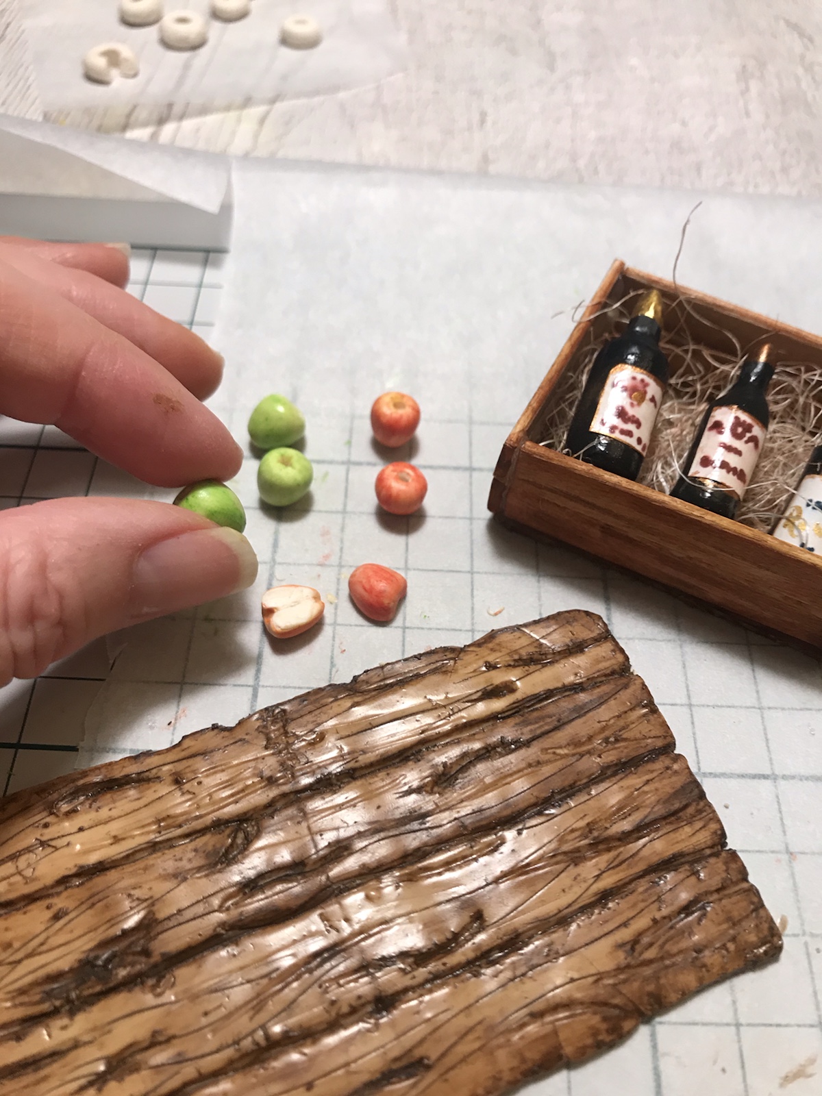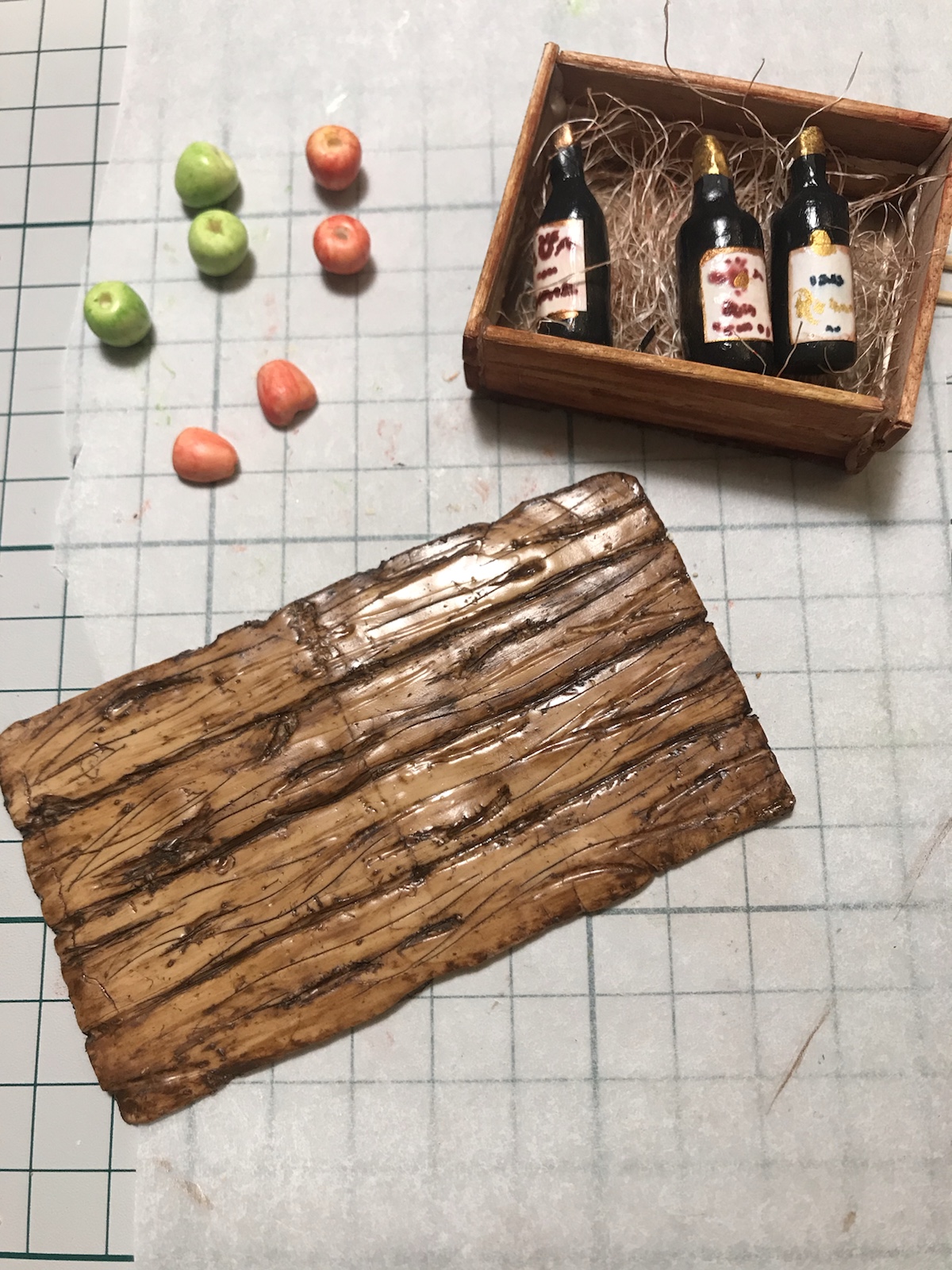 Äpplena och vinflaskorna är gjorda samma lera som bordsskivan. Vinlådan är gjord av glasspinnar och trasslet i lådan har jag repat av från ett rep/snöre.
