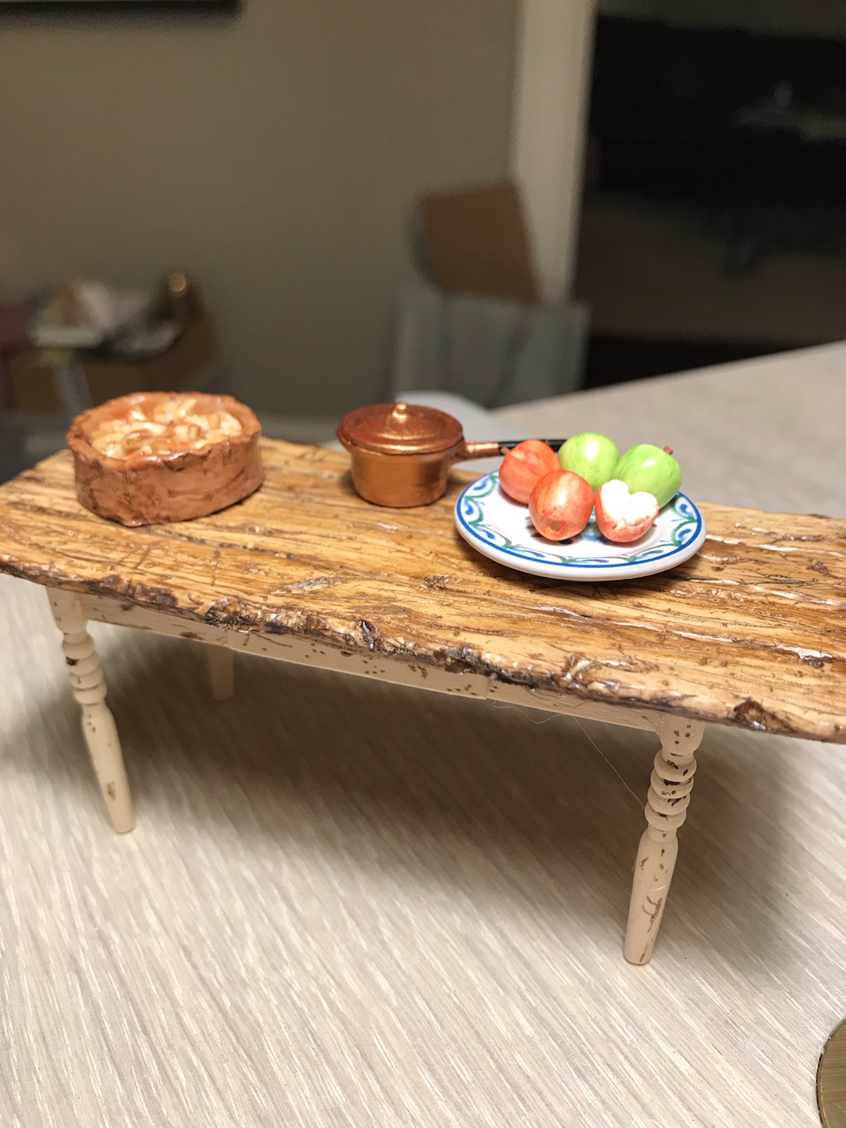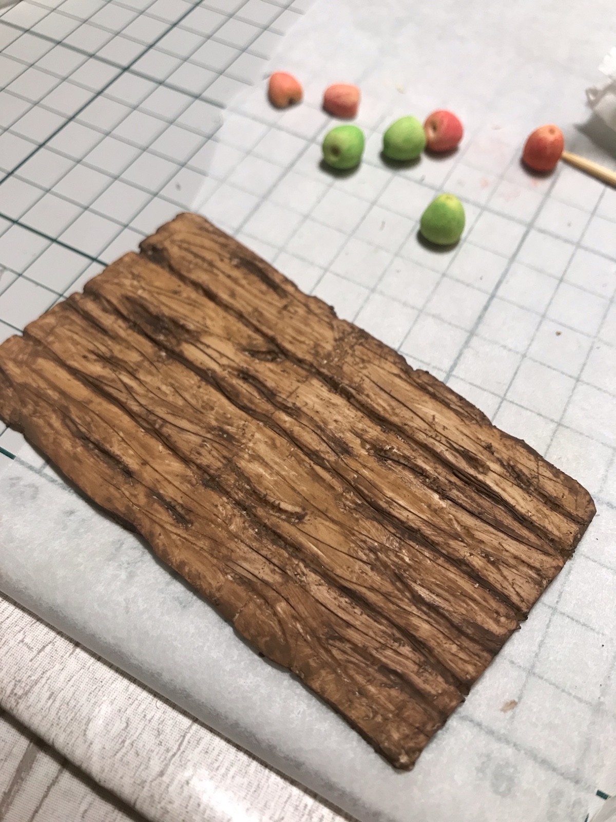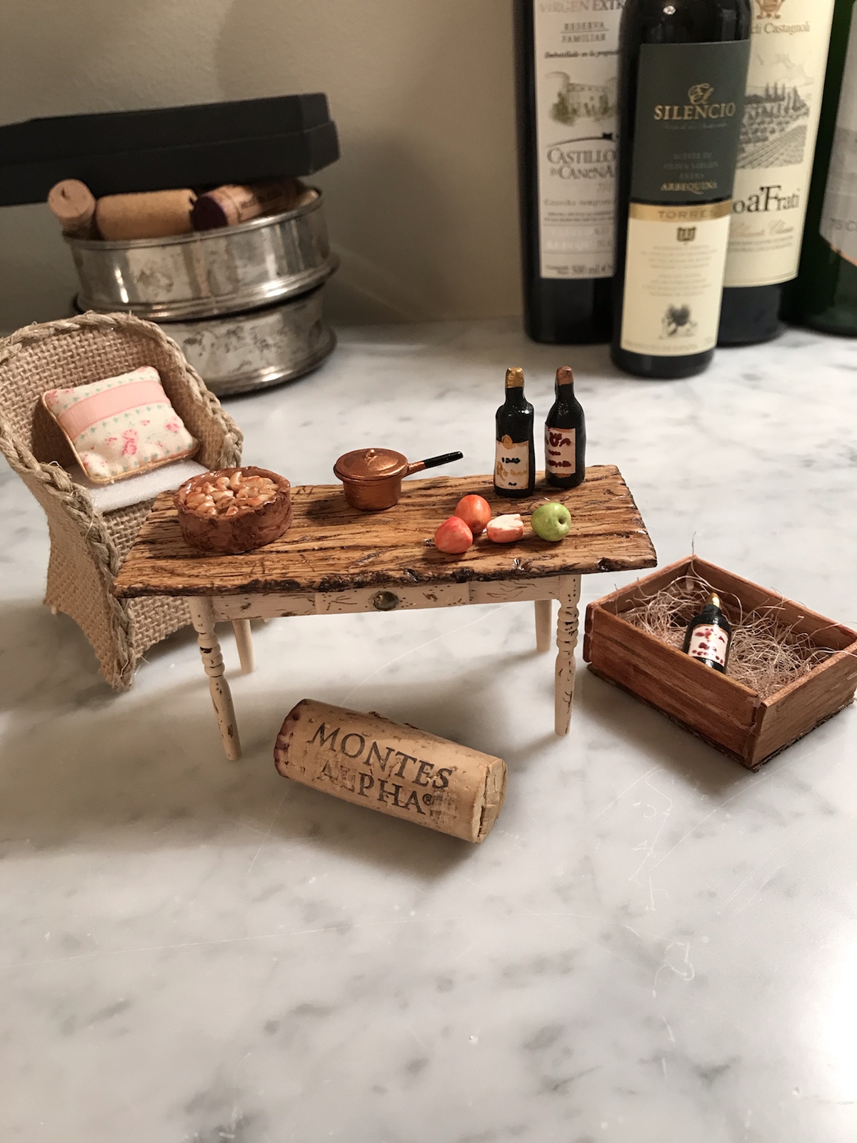 Äpplena och vinflaskorna är gjorda samma lera som bordsskivan. Vinlådan är gjord av glasspinnar och trasslet i lådan har jag repat av från ett rep/snöre.