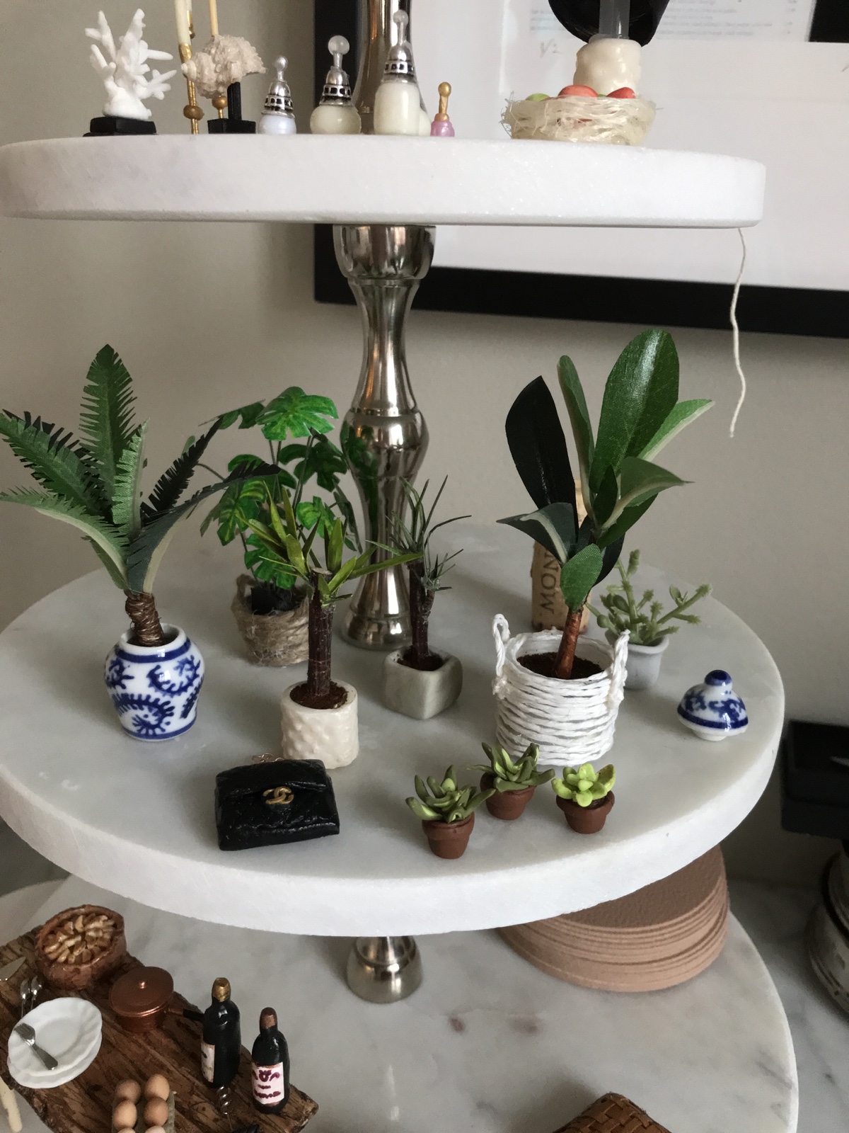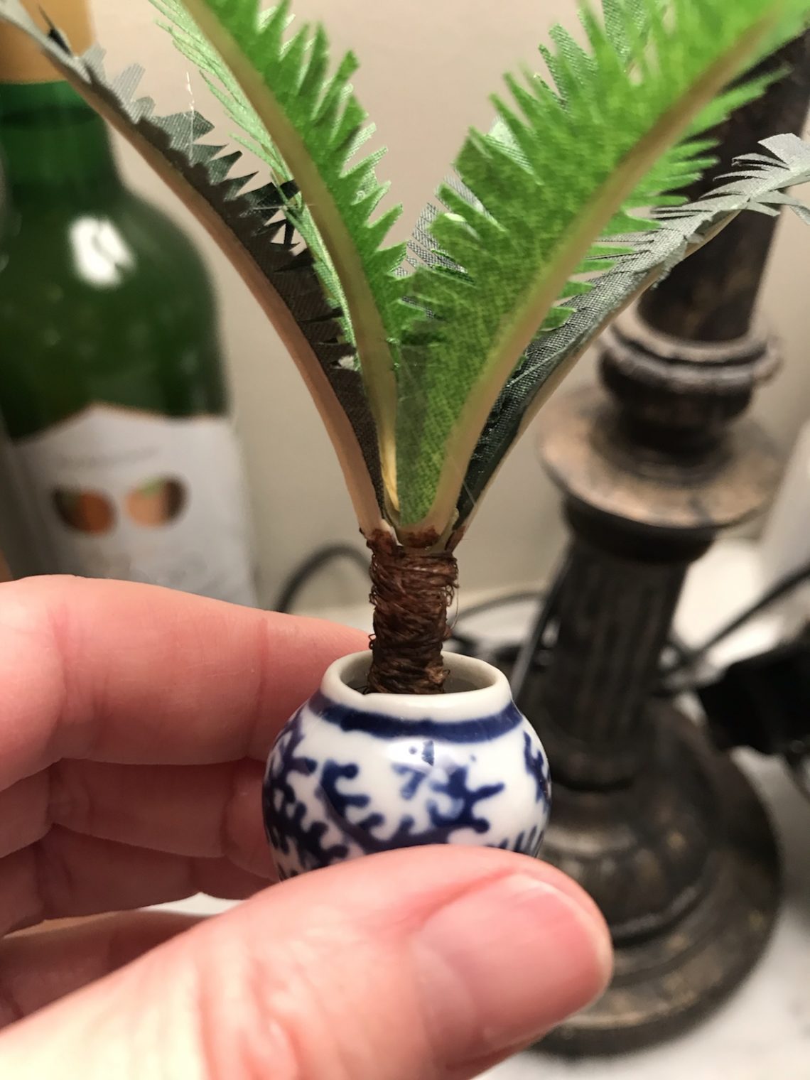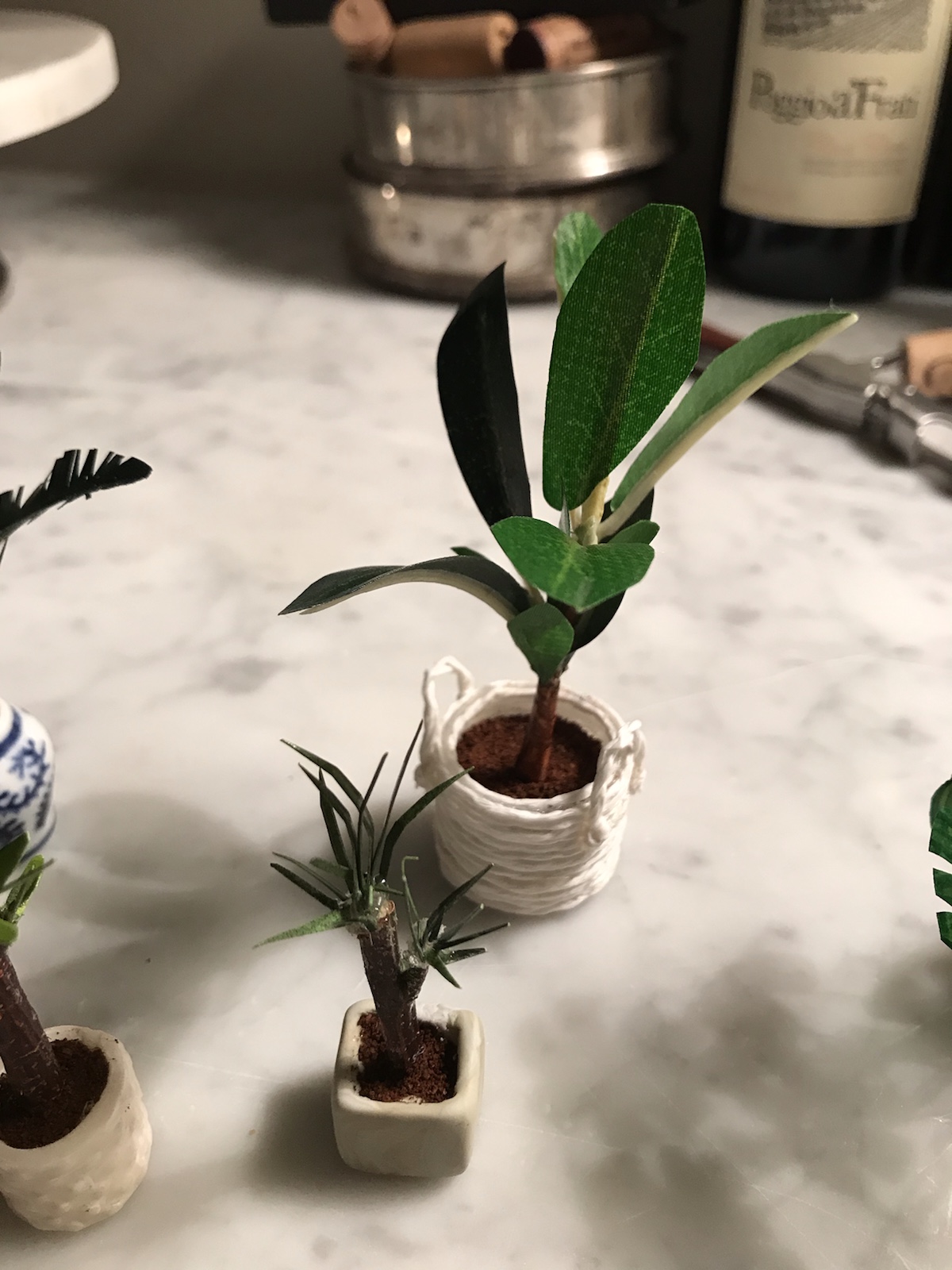 Även ett dockhus måste få lite sköna gröna växter. Jag gick igenom hemmet på jakt efter lämpligt material och valde till slut att offra en kvist från ett fejk-olivträd vi har här hemma. Av de bladen gjorde jag flera olika växter genom att klippa bladen i olika former och målade sedan med olika gula och gröna nyanser av akrylfärg för att få variation. Stammarna har jag gjort på lite olika vis. Två av dem kommer från ett gammalt påskris som jag hade sparat i ett skåp från förra påsken, en annan är en tandpetare som jag lindat fibrer från ett rep runt och sen målat brunt. Den tredje varianten är fejkväxtens stam och den klädde jag med det torra skalet från en gul lök för att göra den mer organisk och få bort det plastiga, målade sen skalet ned brun akrylfärg. Man tager det man haver, helt enkelt. Sen är det bara att börja montera, blad efter blad. Jag använde limpistol som på ett sätt är bra för det torkar snabbt, men ibland kan det bli lite för mycket lim som sedan syns när det torkat och det gillar jag net. Då pillar jag bort och gör om. Väldigt pilligt kan det bli. Krukorna är gjorda av lera eller snöre och som jord använde jag kaffe. / Maria <3
