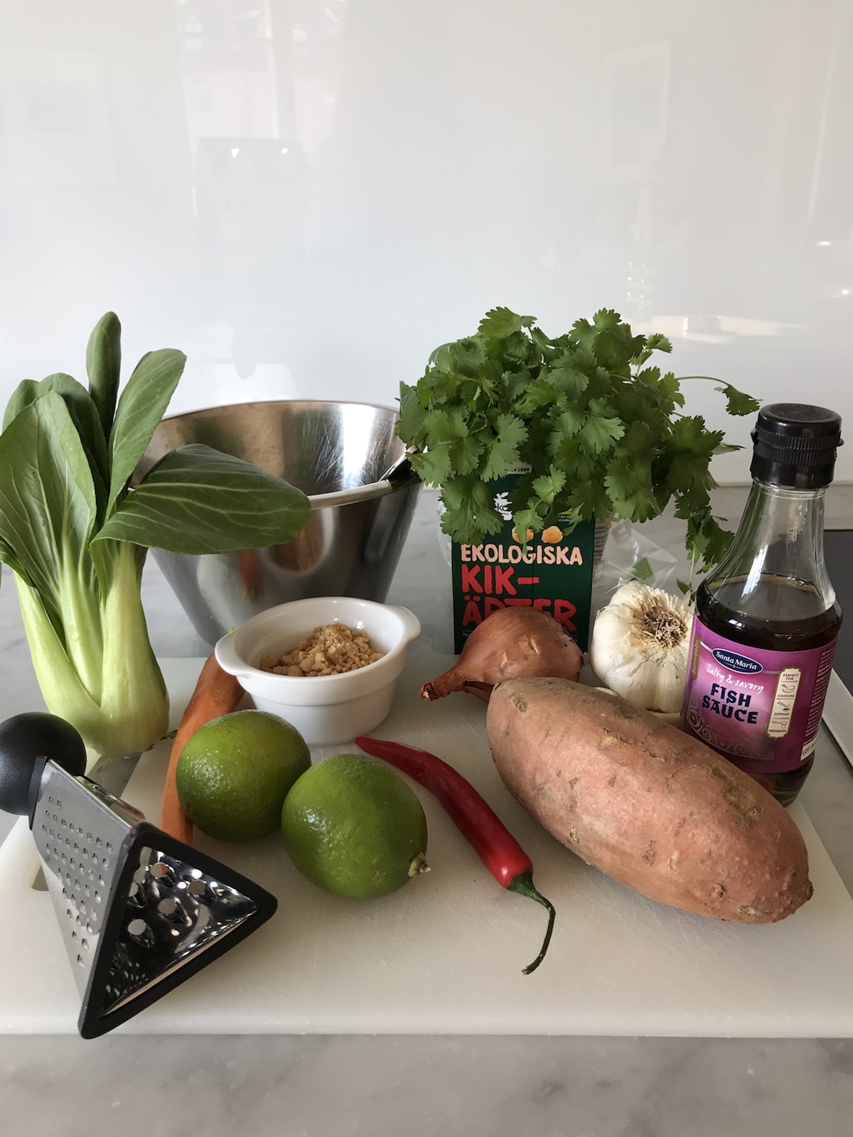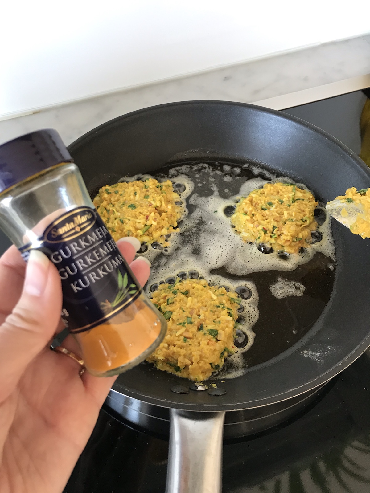Jag vet inte hur det är för er, men för mig kan middagsfrågan vara både himmel och helvete. Vissa dagar finns det noll inspiration och lust men nästa vecka flödar idéer och då är fixandet en ren fröjd. Och däremellan är det rätt okej. Kvällens middag blev kikärtsbiffar med sötpotatismos. Oftast när jag lagar mat är det svårt att dela ett exakt recept eftersom jag för det mesta bara tar det jag hittar i kylen. Kikärtsbiffar, t ex har jag gjort massor med gånger men förmodligen aldrig på samma sätt. Men det blir oftast lika gott vad man än har i dem. Därför vill jag verkligen uppmana alla att utesluta eller lägga till smaker och råvaror efter tycke och smak. Gurkmeja som står med i receptet nedan, använder jag ofta i mat för dess antiinflammatoriska effekter. Se till att kombinera med svartpeppar som sägs öka den goda effekten. Mitt middagstips och mina biffar idag gjorde jag så här: