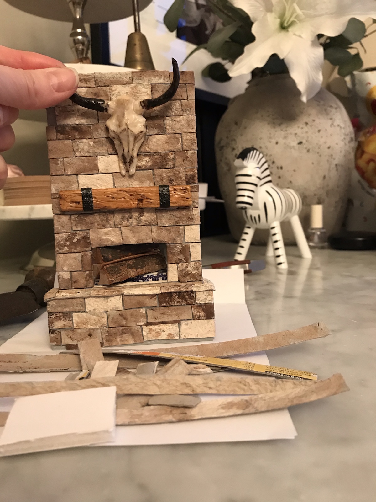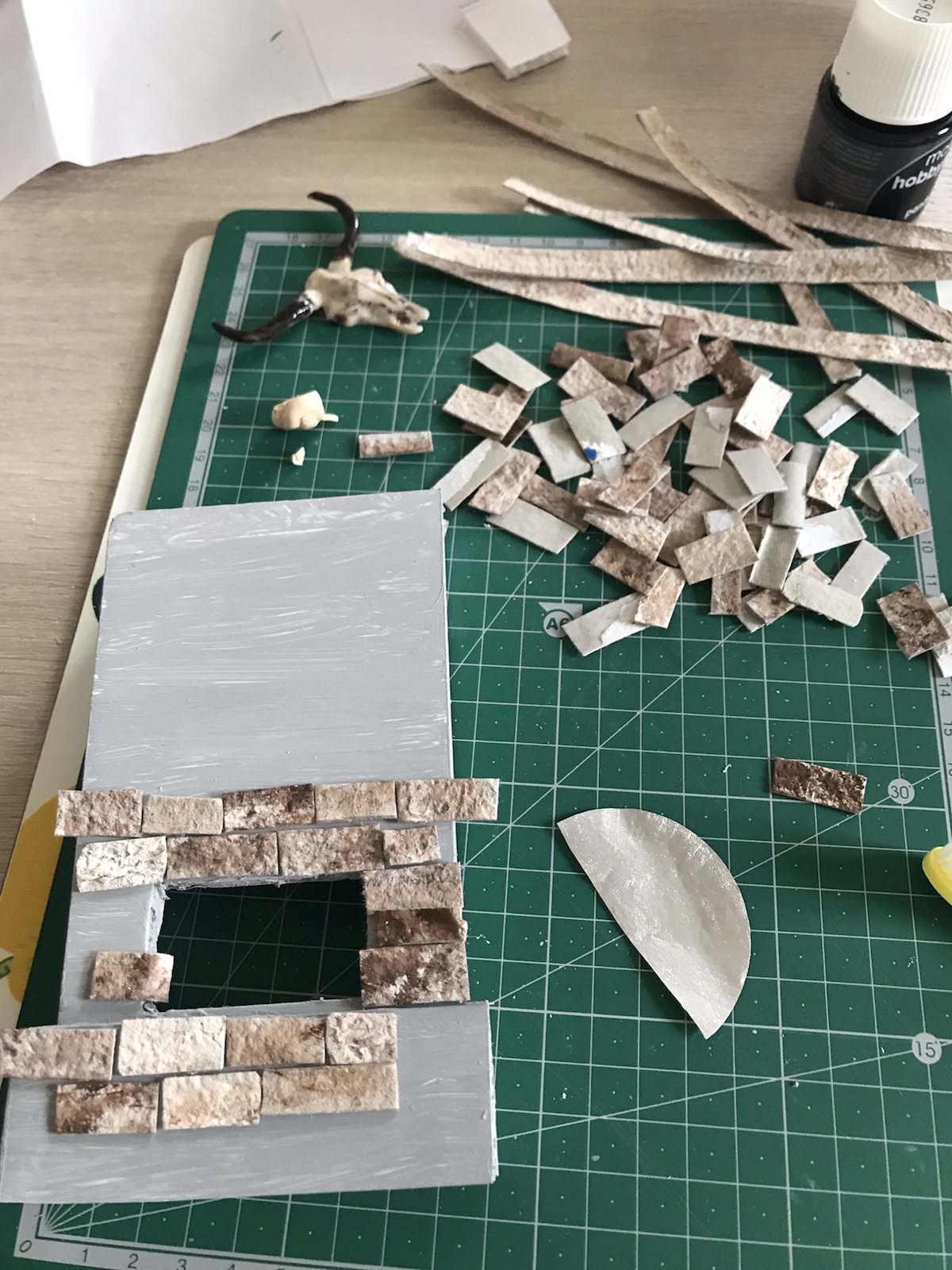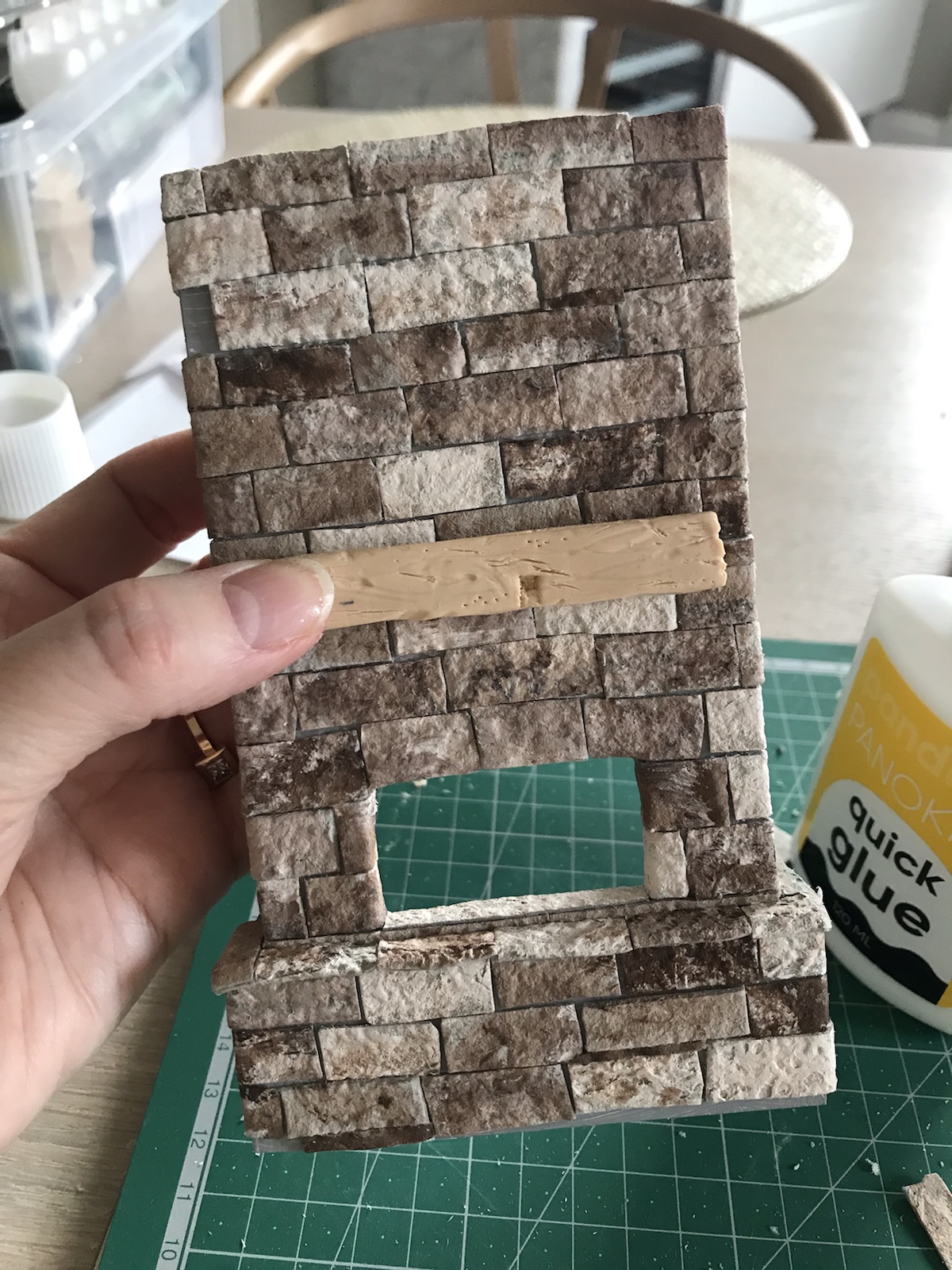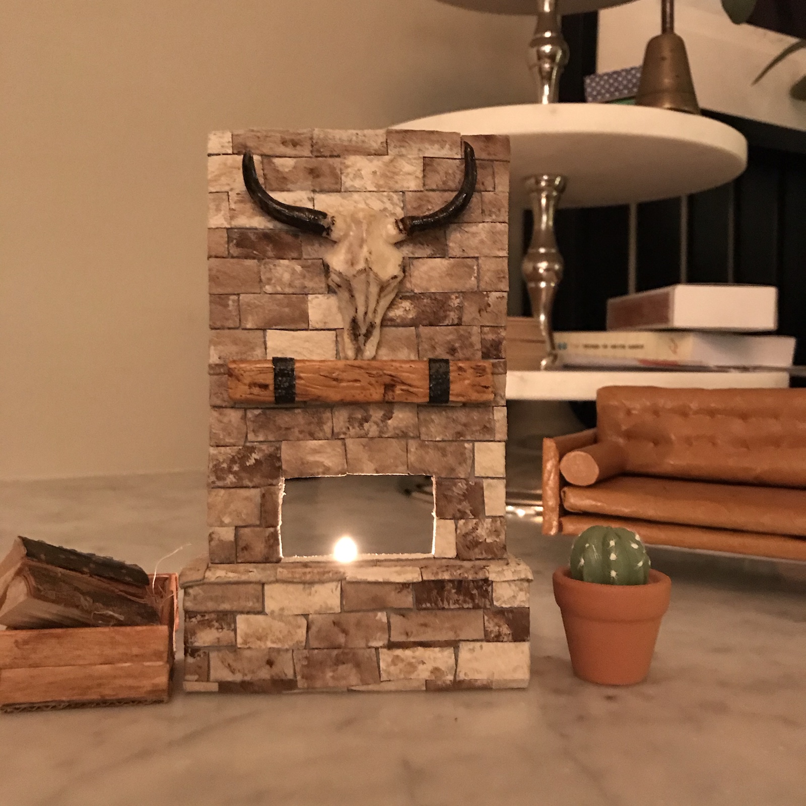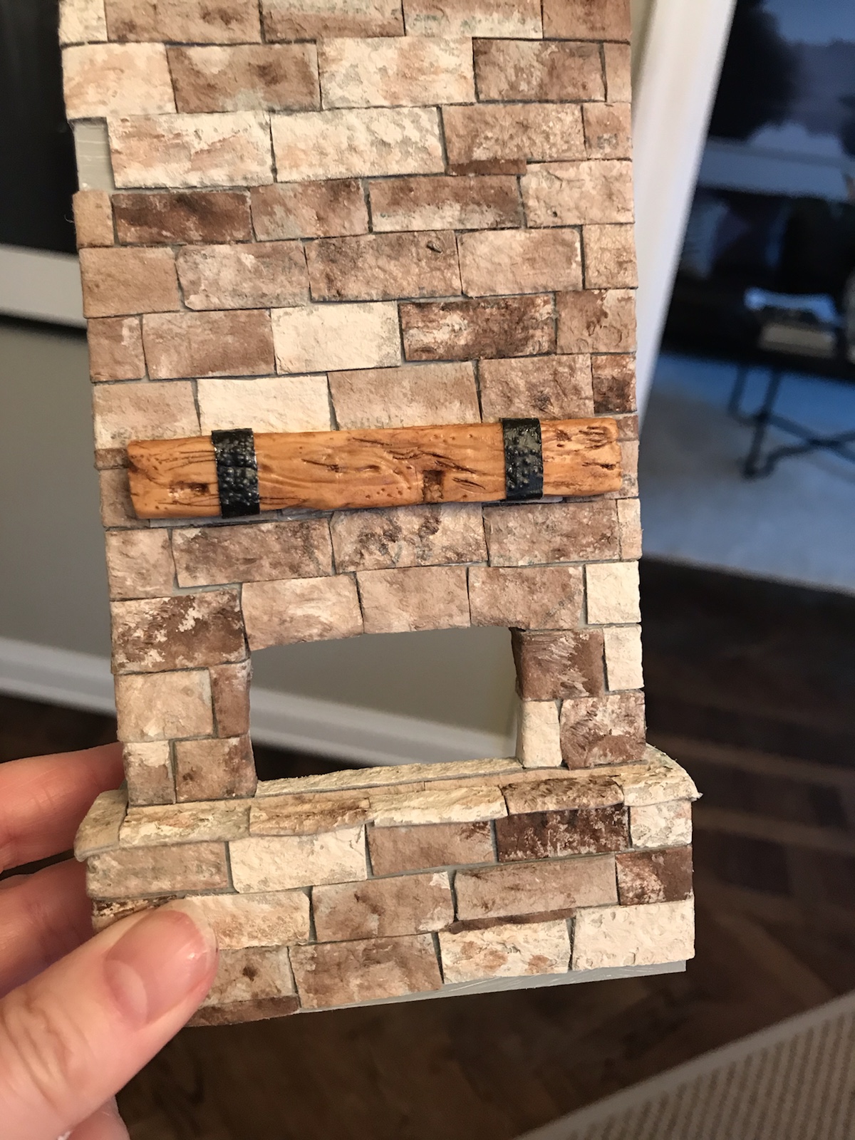 Blev inspirerad av en bild på en härlig murad eldstad, typ sån jag tänker att varje ”liten stuga” i Aspen har, och tänkte att en sån vill jag göra till dockhuset. Sagt och gjort, hittade en nästan tom äggkartong (gjorde muffins på äggen) och började klippa remsor av locket. Den skrovligaste sidan målade jag sen i beige och bruna toner. Jag använde brun akrylfärg och en ljusare beige vattenbaserad hobbyfärg. Duttade ”slarvigt” på färgen för att det skulle naturligt ut. Sen klippte jag bitar av remsorna och började ”mura” upp ”stenarna”. Stommen gjorde jag av foamboard (finns på Panduro bl a). /Maria <3