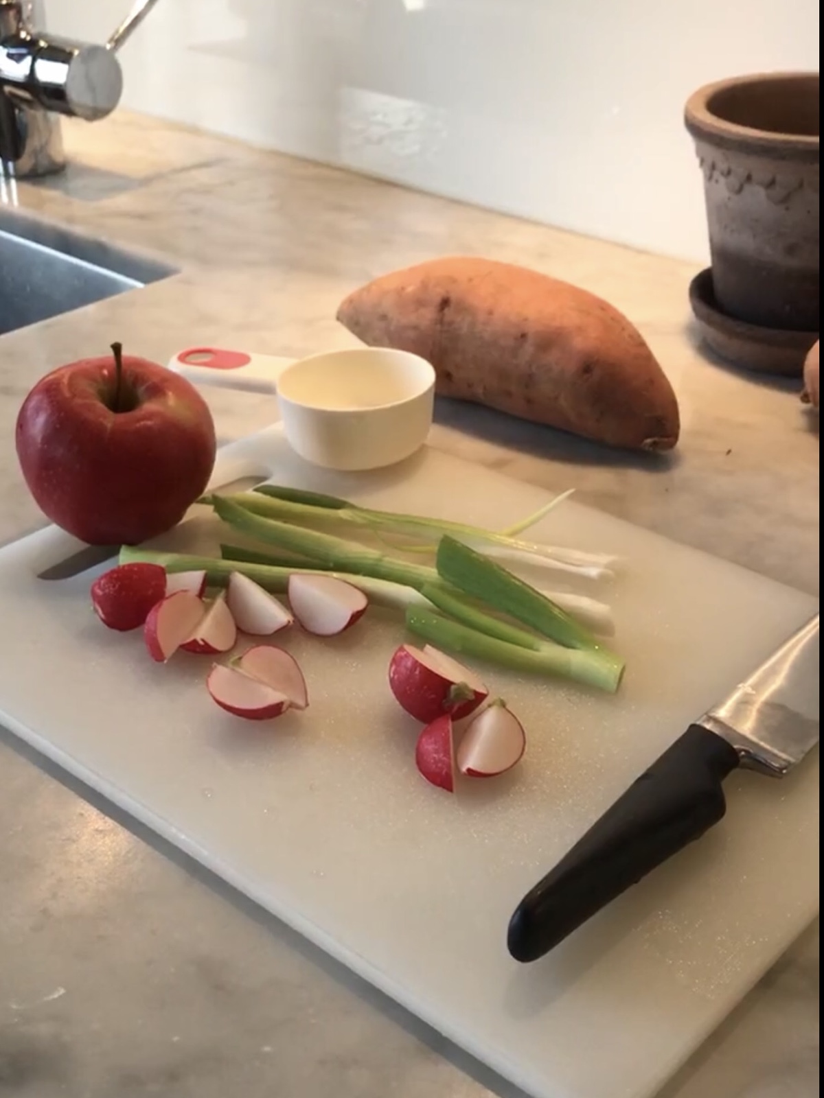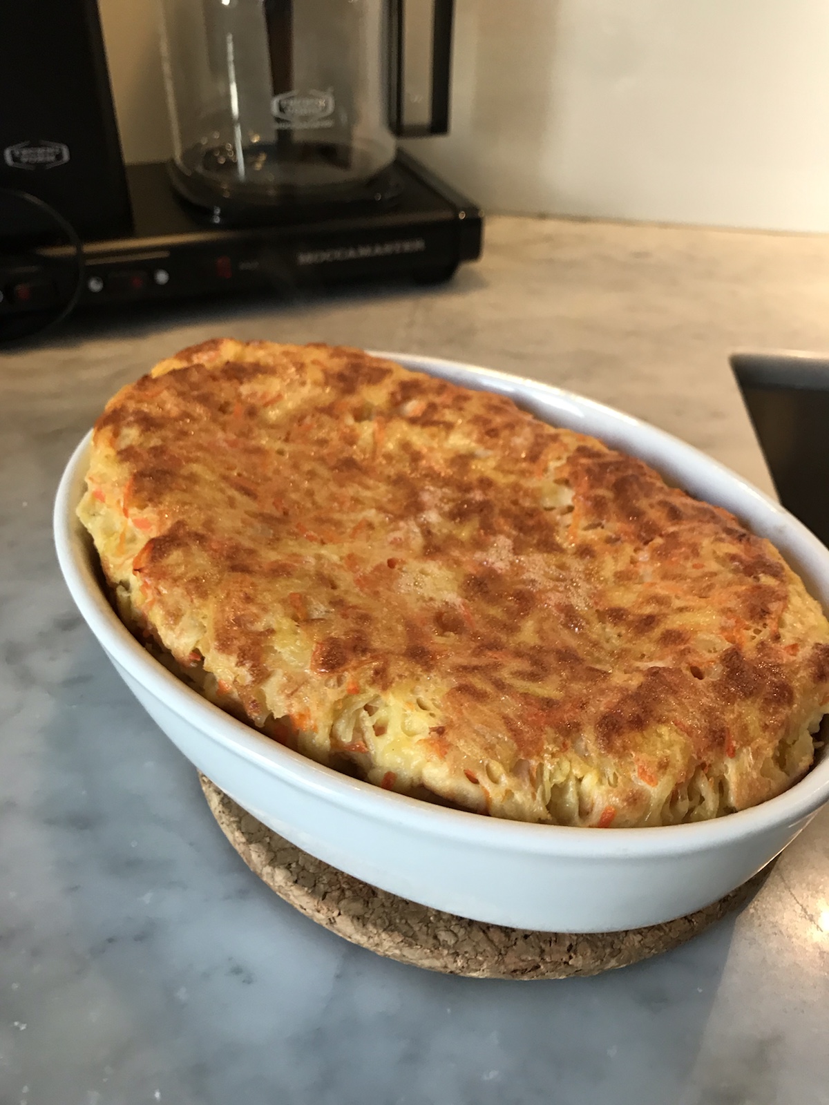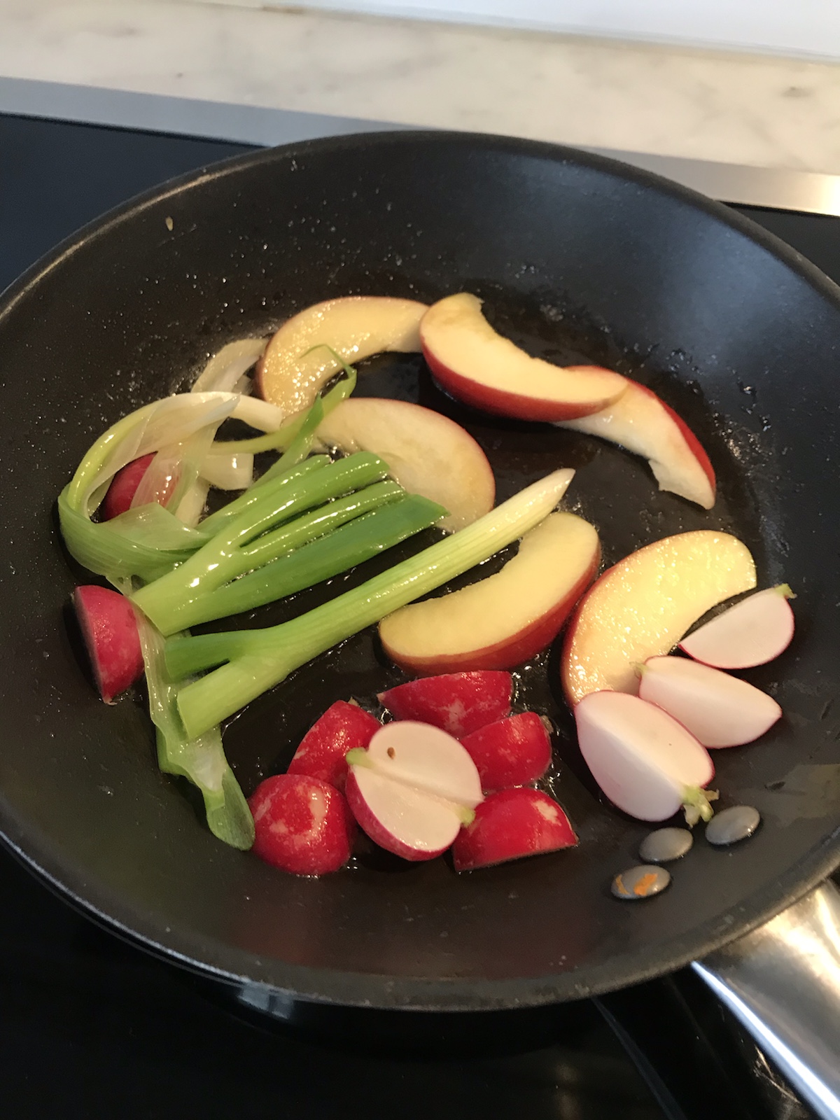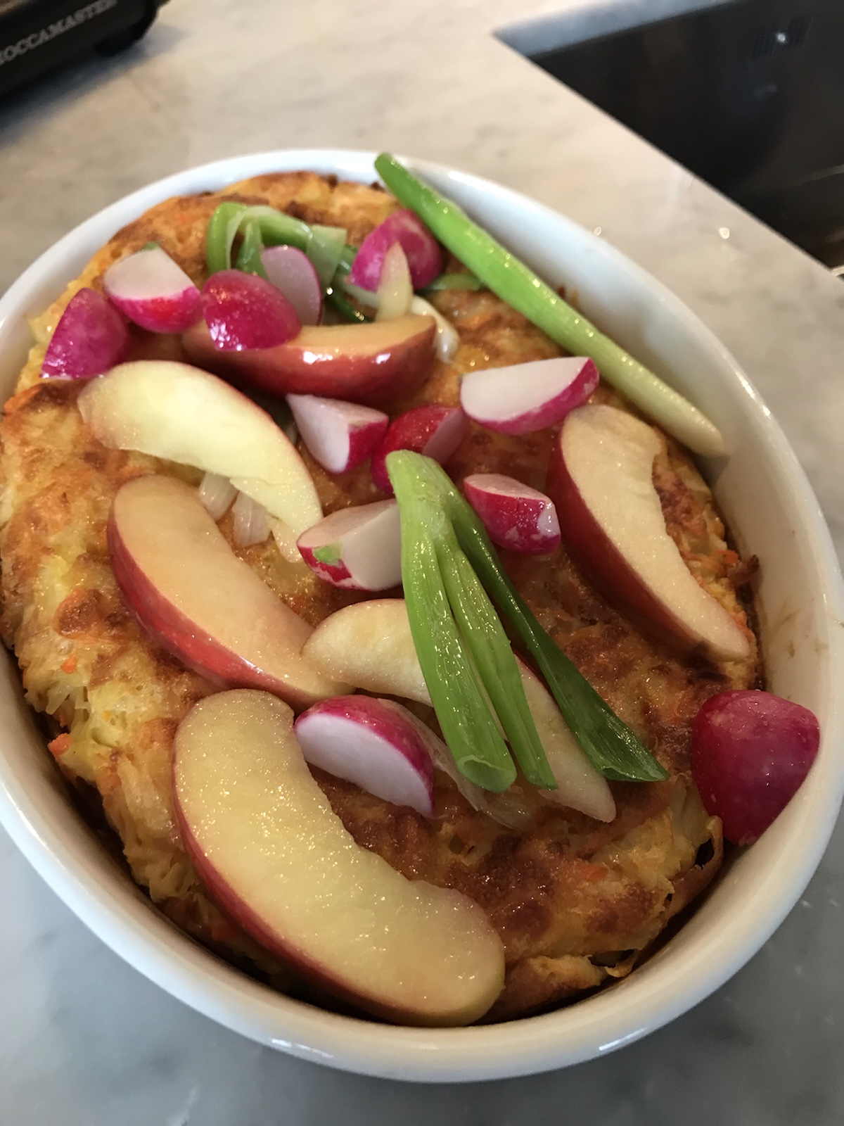 Den klassiska torsdagsrätten, ärtsoppa och pannkaka, hänger kvar och serveras även hemma hos oss ibland, men då oftast i en lite annorlunda version. Idag googlade jag runt för lite inspiration och landade i en grön ärtsoppa som jag har gjort massor med gånger. Älskar den och brukar smaka av med liiite cayennepeppar. (Det är supergott att ha parmesanchips till, bara att riva parmesan och lägga små högar på bakplåtspapper och några minuter i ugn, ca 200 grader). Efter soppan åt vi en ugnspannkaka med riven morot och potatis i för det var de rotfrukter jag hade hemma. Toppade med lite smörstekt vårlök, rädisor och äpple. /Maria <3