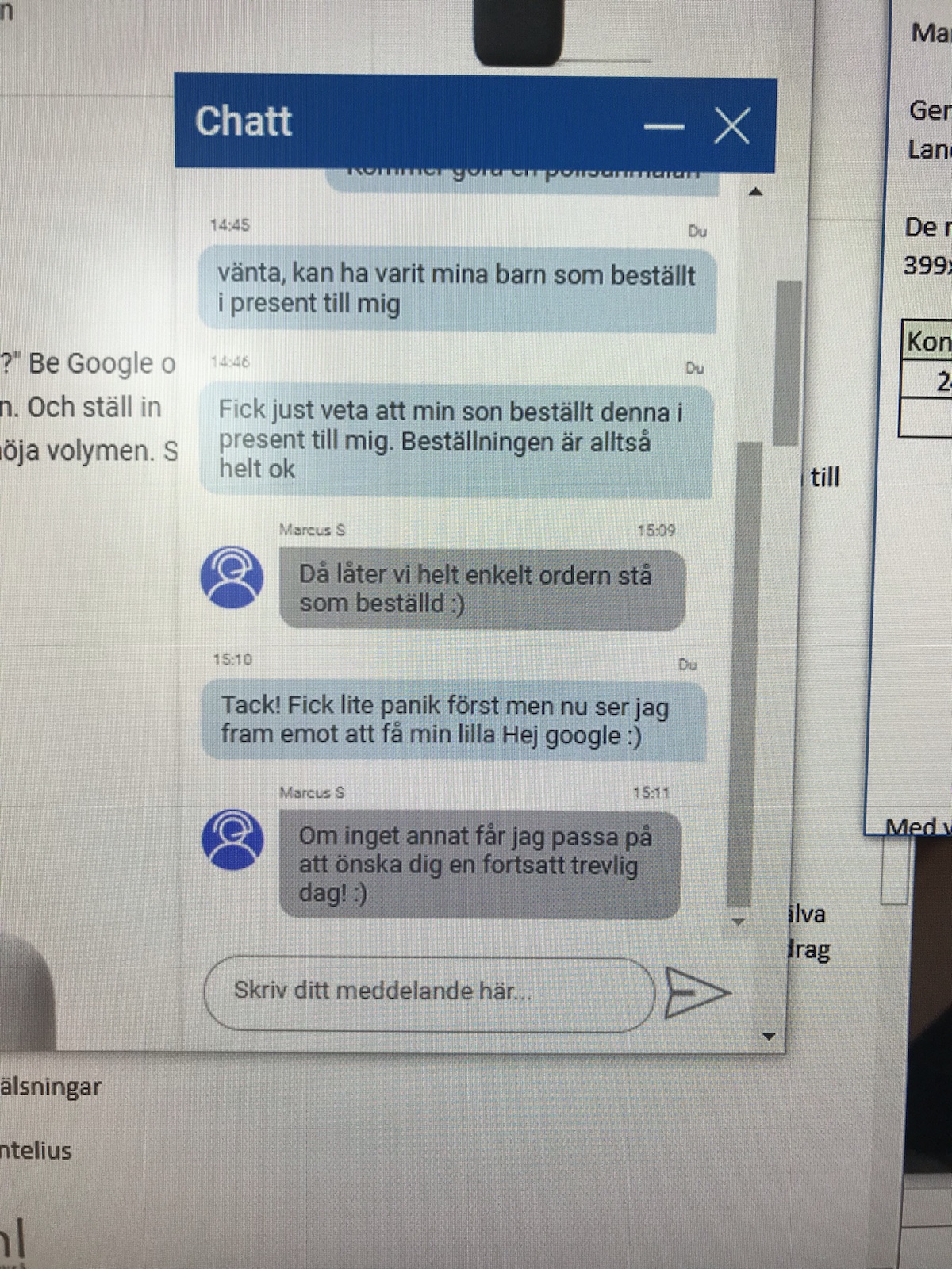 Under pågående chatt får jag en vag känsla av att det kanske finns en annan förklaring. Kikar på produkten igen och förstår först då vad det faktiskt är, en Hej Google-grej, men jag kände inte igen den vid första anblicken då designen är helt ändrad från vad jag tidigare har sett. När väl den poletten trillade ner minns jag att jag vid ett tidigare tillfälle uttryckt att jag vill ha en sån, vilket mina barn tydligen hade snappat upp. Så det var alltså en födelsedagspresent från mina fina kids!/ Maria Sur-Rut <3
