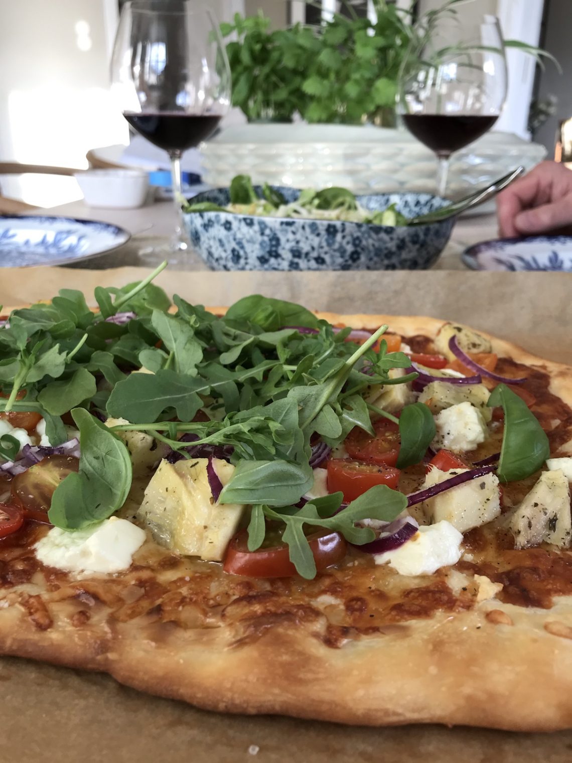 Att göra egen pizzadeg är ganska lätt, har jag förstått, men jag har faktiskt aldrig testat! Ofta vill man ju att det ska gå snabbt att slänga ihop middagen och då tar man sig knappast tid att göra en deg som ska jäsa två gånger. Därför testade jag häromkvällen en färdig pizzadeg på surdeg. Den blev helt ok, tycker jag. Jag gjorde en stor pizza som vi delade på och som fyllning och topping hade jag creme fraiche,riven mozzarella, riven parmesan (gräddade sen ca 8 minuter innan jag la på övrig topping), småtomater i olika färger, smulad fetaost, kronärtskockor, salt och svartpeppar (in i ugnen igen ca 8-10 min) och…