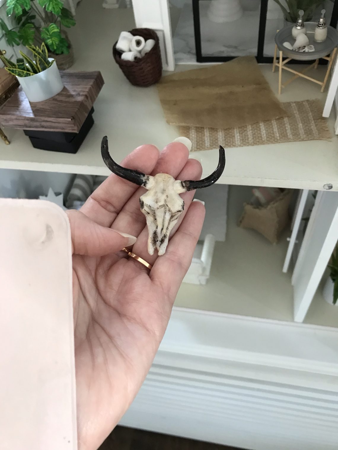 Om ni trodde att jag gett upp mina miniatyrer trodde ni fel. För även om det inte jobbas lika mycket här hemma nu när vi har tropisk sommarvärme à la fantasi/låtsas/ofattbart/inte på riktigt i Sverige, så smyger jag till mig några minuter då och då. Det senaste var dock inte äppelpajen utan (hua, jag som typ slutat äta kött för att jag tycker synd om djuren! Men det är faktiskt i fimolera och inte på riktigt) en buffelskalle med horn. Makabert, jag vet. Men det blev en liten miniatyrutmaning att göra den till dockhuset. Nonno har inte sett den än. Vet inte vad hon kommer tycka…/ Maria <3