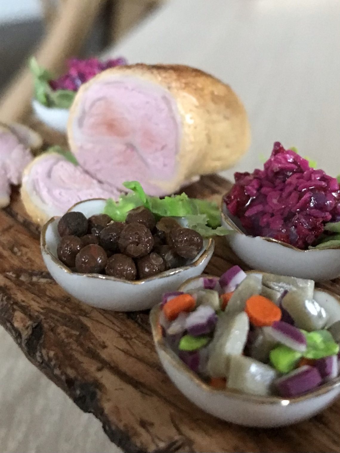 …i miniatyr, då. Skinka, köttbullar, rödbetssallad och inlagd sill på bordet. Allt, utom bordsbenen, skålarna och glasburken, är gjort av fimolera. Jag försöker blanda så bra färgnyanser som möjligt av leran men för den slutliga finishen använder jag soft pastell eller akrylfärg, ibland utblandade med vatten. Sent igår kväll blev de små rätterna färdiga. / Maria <3 Efter soft pastell för att få en griljerad look. Försöker skapa struktur och textur som ska försöka likna riktig julskinka. Jag använder nålar och tandpetare, men det är svårt att få till det för det är väldigt smått. Sillbitar som väntar på att få lite silvertouch och rödlök Lite morötter också … ……