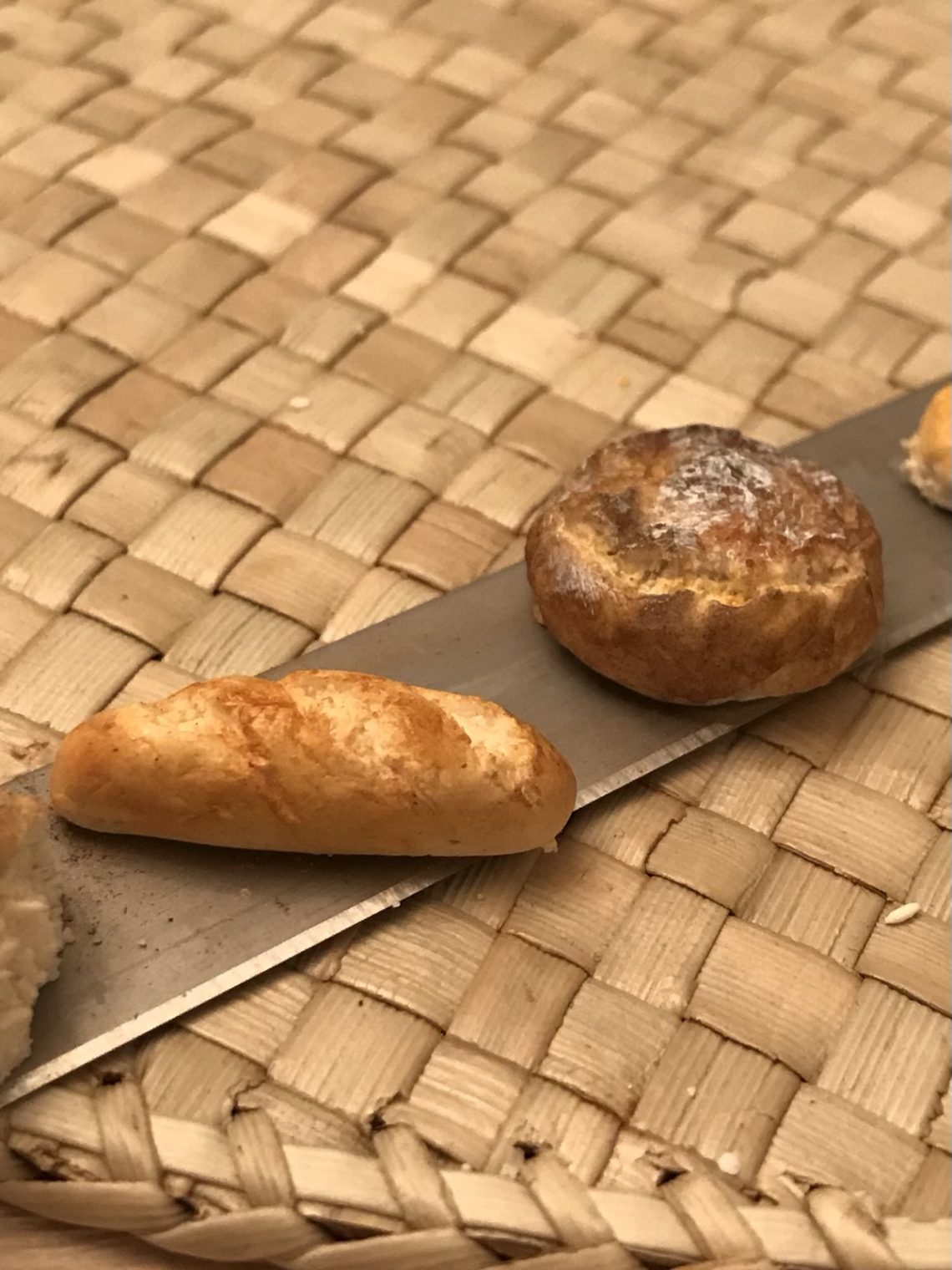 Mera mini. Här är mitt senaste pyssel, bröd i olika tappning. Det är kul att laborera med färger, skuggning och texturer för att få till olika sorters bröd. Jag har använt fimo-lera och soft pastell och lite vit akrylfärg till ”mjölet” på de runda limporna. / Maria <3 Gräddas inför slutliga finishen. Före lack