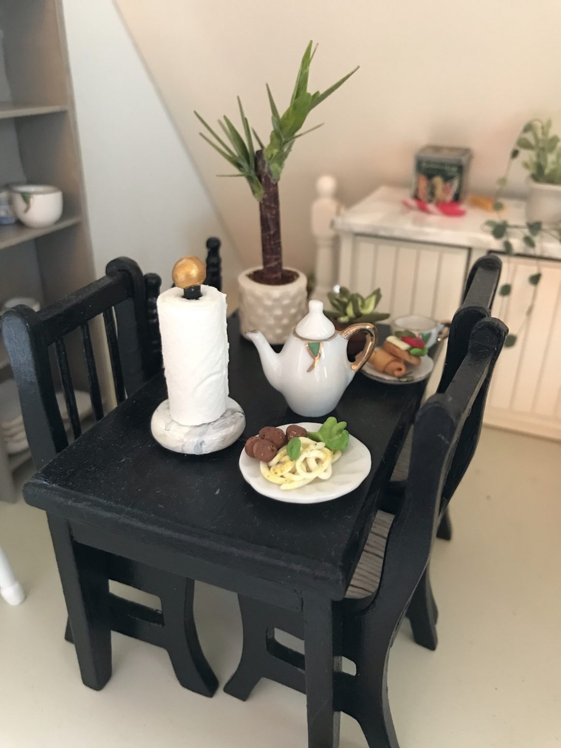 Denna söndageftermiddag tog jag en sväng till Ikea. Hade hört att det kunde vara långa köer för att komma in för att man ska hålla covid-avstånd men idag var det inga köer och ganska lugnt inne i varuhuset. Blev lite galgar, en matta och lite korgar. Väl hemma igen blev det lite pyssel till dockhuset. Vi har själva en hushållspappershållare med marmorfot i köket och just denna ville jag försöka reproducera i miniformat till dockhuset. / Maria <3